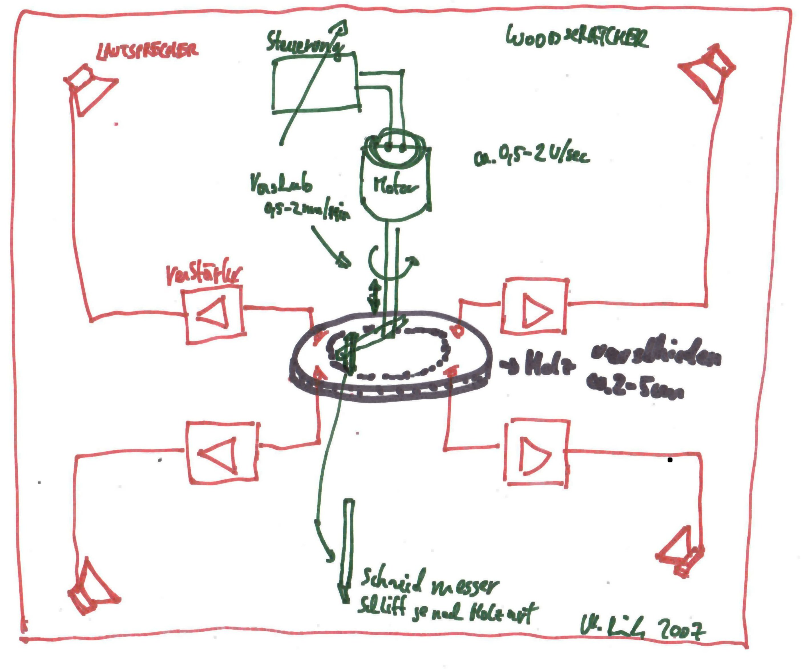 Score - PartiturThe construction overview plan is also the score of the piece. http://algo.mur.at/projects/woodscratcher/media/partitur/viewhttp://algo.mur.at/projects/woodscratcher/media/partitur/@@download/image/woodscratcher_partitur_dick.jpg